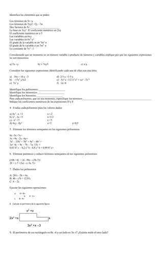 Este documento presenta una serie de ejercicios relacionados con la identificación y manipulación de expresiones algebraicas como monomios, polinomios, binomios, coeficientes numéricos y operaciones entre polinomios. Se pide identificar elementos en expresiones dadas, evaluar polinomios para valores específicos, eliminar términos semejantes, reducir expresiones y calcular perímetros de figuras geométricas definidas por expresiones algebraicas.