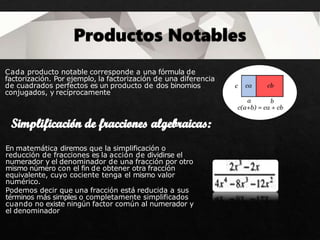 El documento trata sobre expresiones algebraicas y operaciones con fracciones. Explica cómo simplificar fracciones poniéndolas a común denominador y cómo realizar operaciones como suma, resta, multiplicación y división con fracciones algebraicas. También cubre temas como factorización de polinomios, cuadrados de binomios y trinomios, y la regla de Ruffini para dividir un polinomio por un binomio.