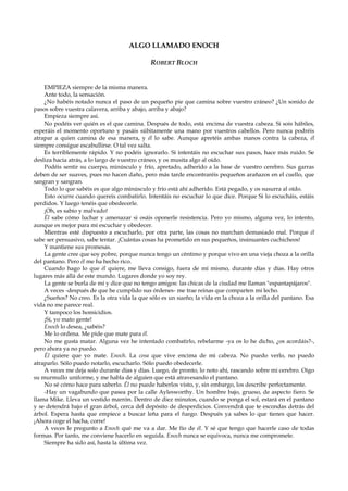 Este documento narra la historia de Seth, un hombre que vive solo en una cabaña cerca de un pantano. Seth afirma que una criatura llamada Enoch vive sobre su cabeza y le ordena que mate personas. El documento describe cómo Enoch le ordenó a Seth matar a una chica llamada Emily Robbins, lo que llevó a que Seth fuera arrestado y encarcelado. Mientras está en prisión, Seth le cuenta su historia al doctor Silversmith, pero el doctor no cree la historia de Enoch y piensa que Seth está loco.