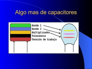 Este documento habla sobre capacitores y sus códigos de colores. Los capacitores tienen códigos de colores que indican su valor y tolerancia. También se numeran para identificarlos.