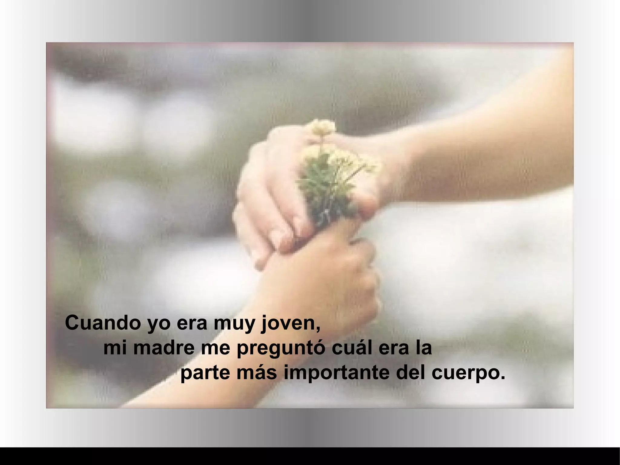 El documento describe una conversación entre una madre y su hijo sobre cuál es la parte más importante del cuerpo. La madre le pregunta al hijo varias veces y él responde incorrectamente los oídos y los ojos. Finalmente, después de la muerte del abuelo, la madre le explica que la parte más importante son los hombros porque permiten a otra persona apoyar su cabeza cuando llora, ya que todos necesitamos de alguien en quien apoyarnos en momentos difíciles.