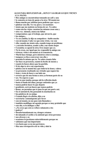 La amiga le cuenta a otra amiga que se queja de las visitas frecuentes de su madre, pero la otra amiga le dice que ella visita a su madre con frecuencia porque murió. Esto hace que la primera amiga reflexione sobre valorar el tiempo con sus padres mientras aún los tiene. El mensaje final es que debemos apreciar el cariño de las personas cercanas mientras están presentes.