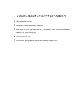 El documento describe los pasos para realizar mantenimiento preventivo y correctivo de hardware y software. Para el mantenimiento preventivo de hardware, incluye recibir el equipo, verificar que todos los componentes funcionen correctamente, limpiar el interior y componentes, y volver a ensamblar y probar el equipo. Para el mantenimiento preventivo de software, detalla recibir el equipo de cliente, desconectar componentes internos, limpiarlos y volver a conectarlos para verificar el funcionamiento. Finalmente, para el mantenimiento correctivo de hardware, enumera encender el equipo