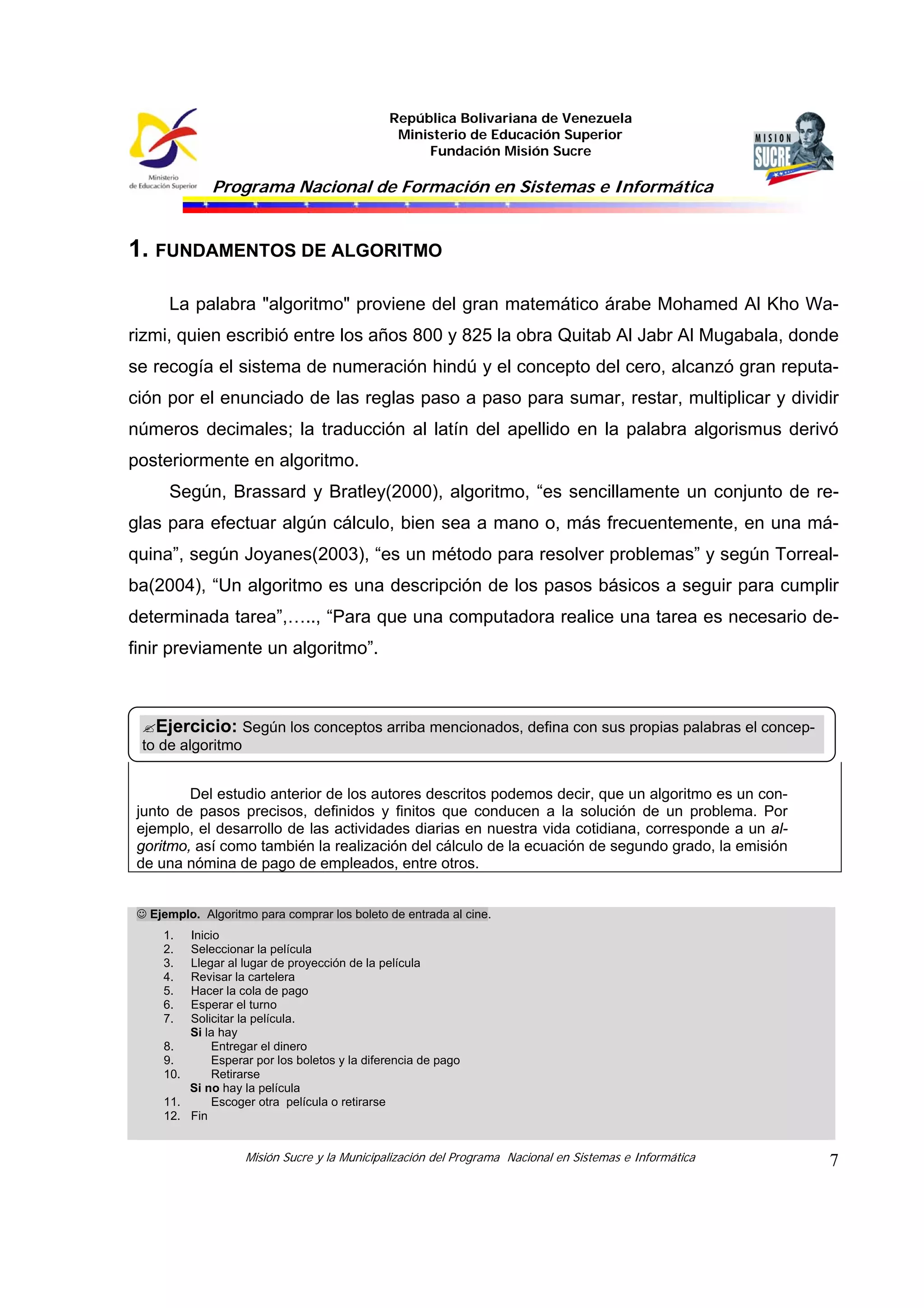 El documento habla sobre los conceptos fundamentales de algoritmos. Define algoritmo como un conjunto de pasos precisos para resolver un problema. Explica que los algoritmos tienen tres partes: entrada, proceso y salida. También describe los elementos clave para construir algoritmos como instrucciones, comandos, datos, variables y constantes.