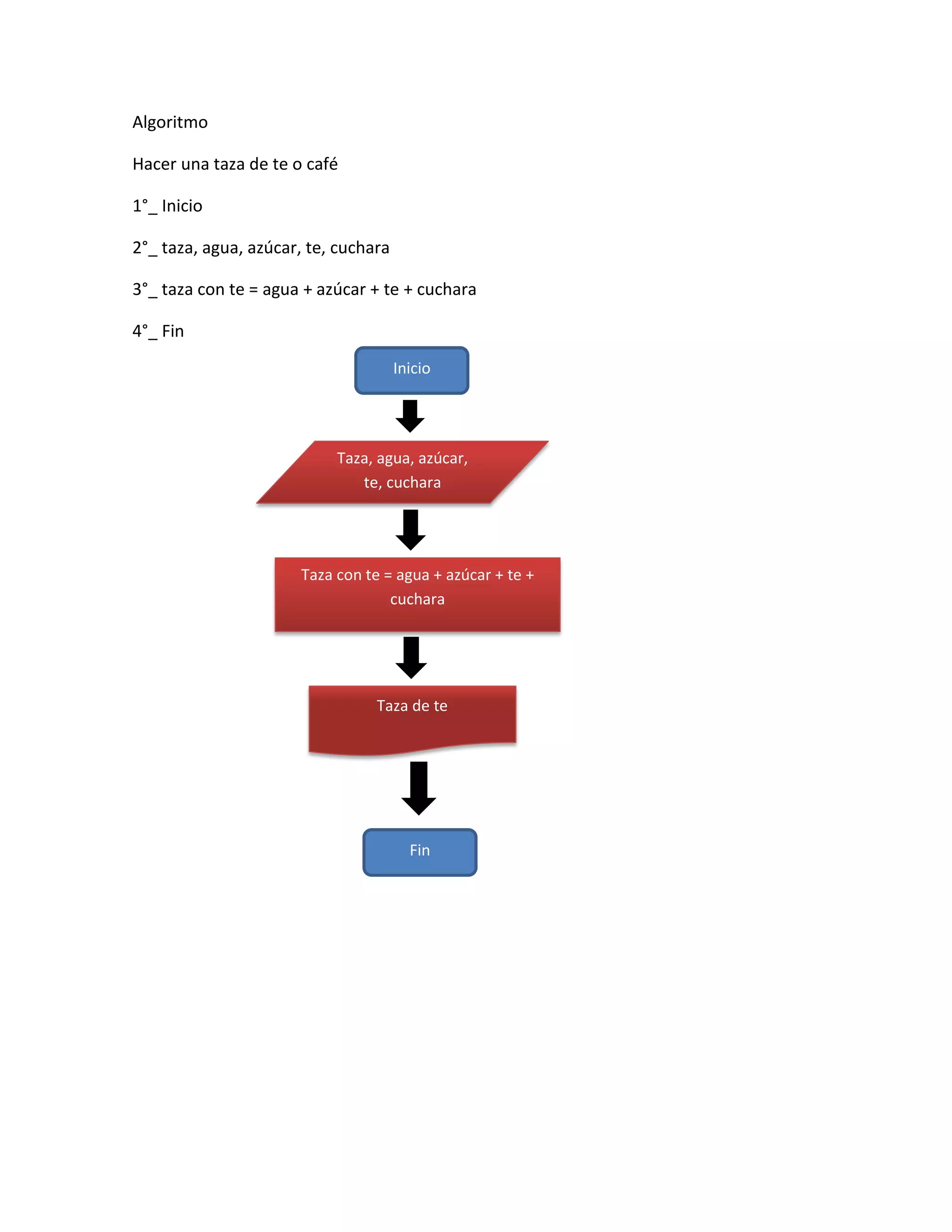 Este documento contiene varios algoritmos para realizar diferentes operaciones matemáticas y lógicas como calcular el área de figuras geométricas, sacar promedios, determinar el mayor de dos números, elaborar recetas de comida y más. Cada algoritmo sigue los pasos típicos de inicio, entrada de datos, proceso y salida.