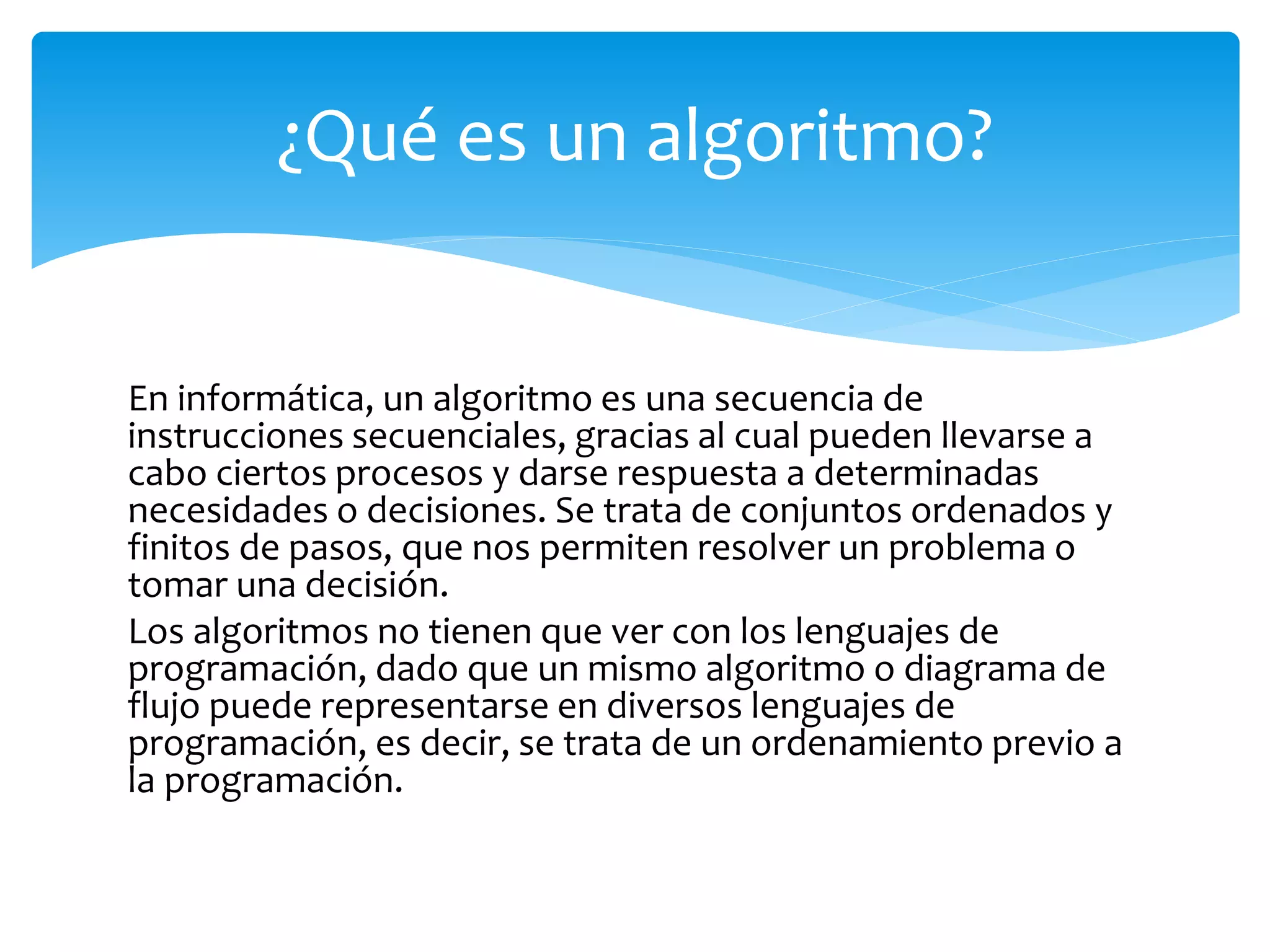 Este documento define los conceptos de algoritmo y pseudocódigo. Explica que un algoritmo es una secuencia de instrucciones para resolver un problema de manera ordenada y finita. Describe las partes de un algoritmo (entrada, proceso y salida) y sus características. Además, introduce el pseudocódigo como una forma de escribir los pasos de un programa en un lenguaje cercano al de programación. Por último, define los diagramas de flujo como una representación gráfica de un algoritmo.