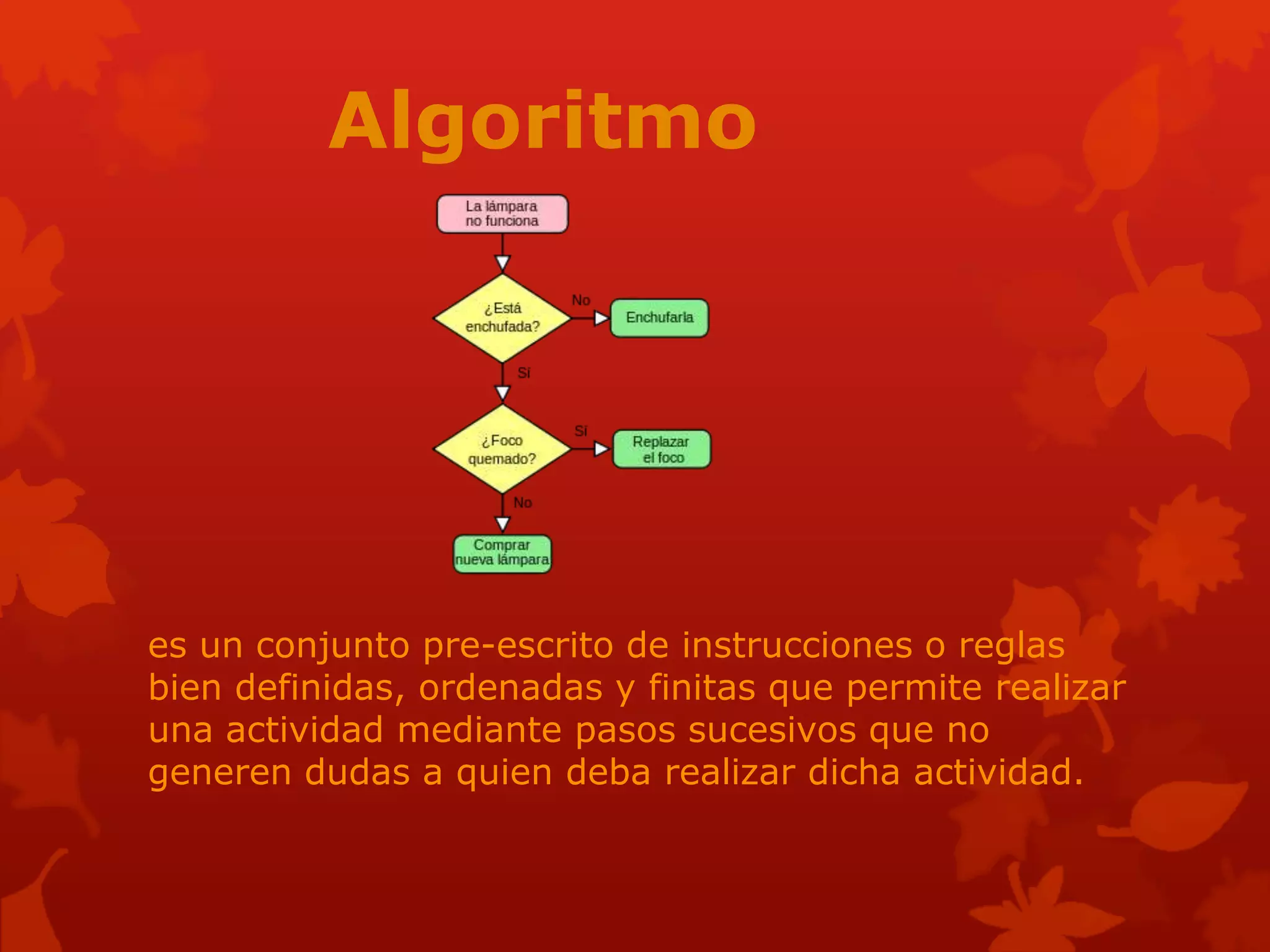 Un algoritmo es un conjunto de instrucciones bien definidas y ordenadas para resolver un problema o realizar una tarea. Los algoritmos se representan gráficamente a través de diagramas de flujo o mediante pseudocódigo, el cual emplea una mezcla de lenguaje natural y sintaxis de programación para describirlos de manera más concisa. Finalmente, la teoría de autómatas y funciones recursivas proveen modelos matemáticos formales para representar algoritmos de manera precisa e independiente de cualquier computadora o lenguaje de programación en particular.