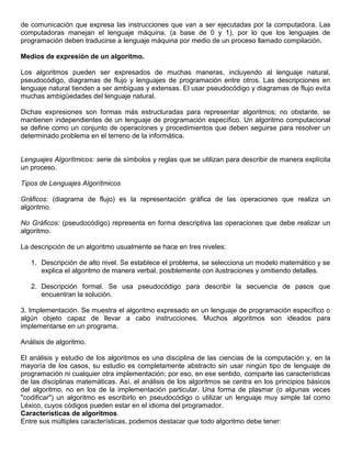 Un algoritmo es una serie de pasos precisos y ordenados para resolver un problema. Los algoritmos se originan en las matemáticas y son fundamentales en computación, resolviendo problemas de la vida cotidiana y procesando datos. Un algoritmo se convierte en un programa de computadora cuando se implementa en un lenguaje de programación específico.