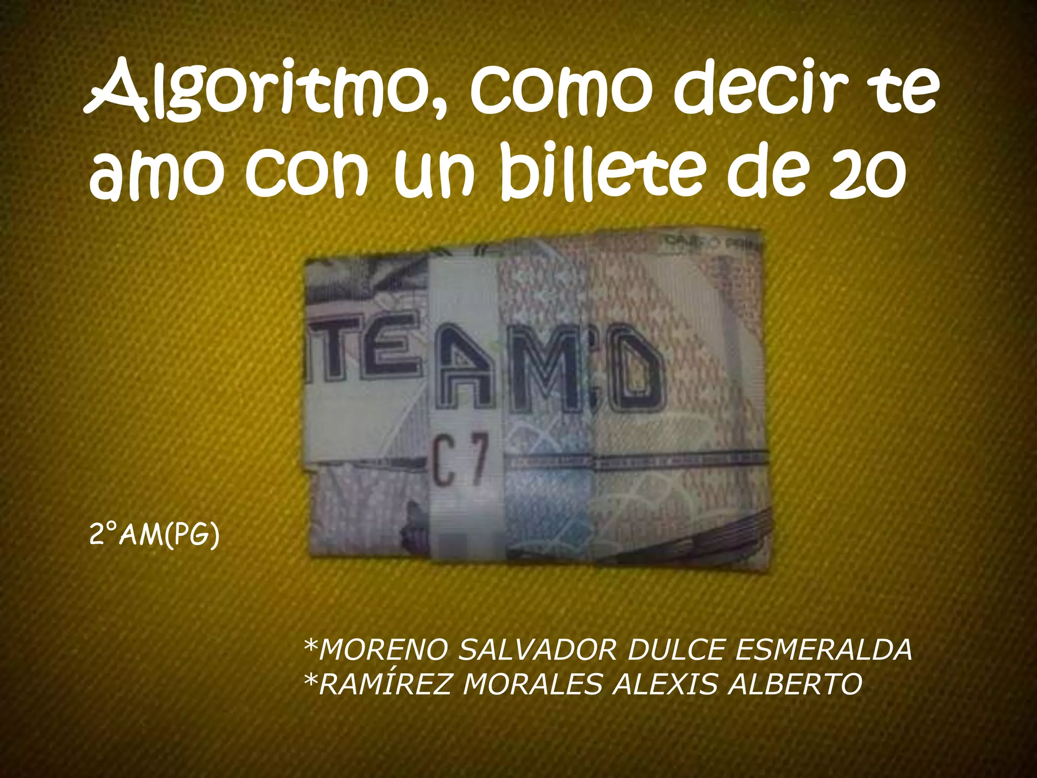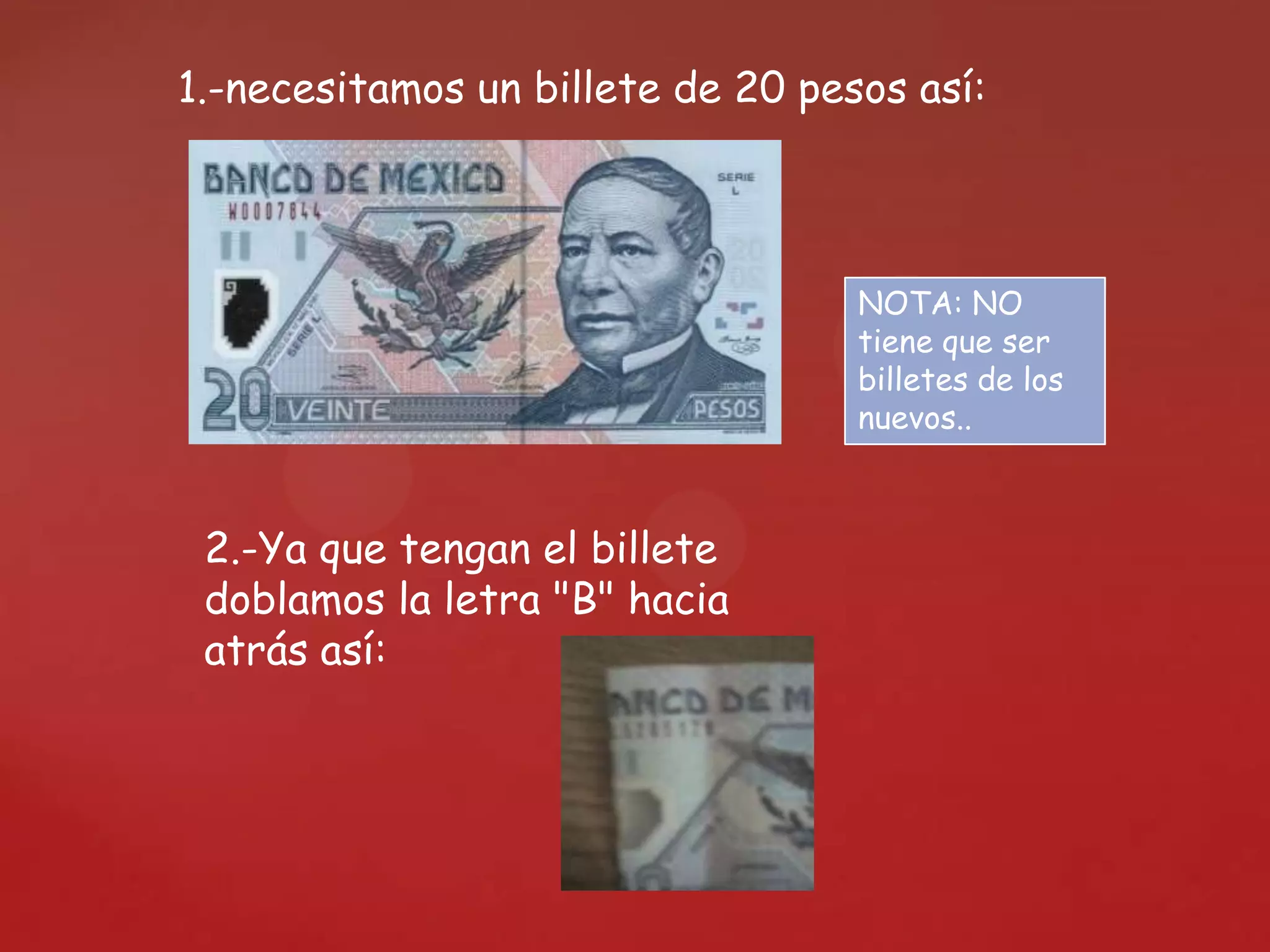 Este documento proporciona instrucciones paso a paso para doblar un billete de 20 pesos de manera que forme las palabras "AMO TE" como una declaración de amor. Las instrucciones incluyen doblar las letras "B", "A", "M" y "O" para formar la palabra "AMO" y luego doblar la palabra "VEINTE" para separarla en "VEIN" y "TE", colocando "TE" junto a "AMO".