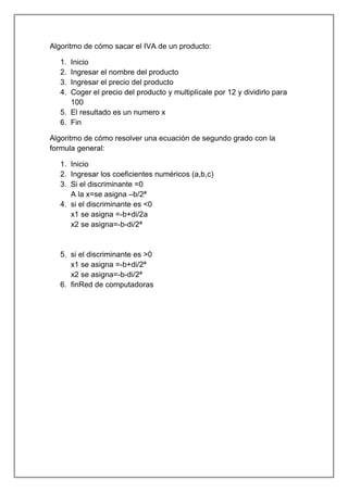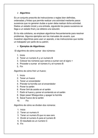 Un algoritmo es un conjunto de instrucciones ordenadas y definidas para realizar una tarea específica y llegar a un resultado final. Los ejemplos incluyen algoritmos para sumar números, freír un huevo, dividir números, calcular el IVA de un producto y resolver ecuaciones de segundo grado.