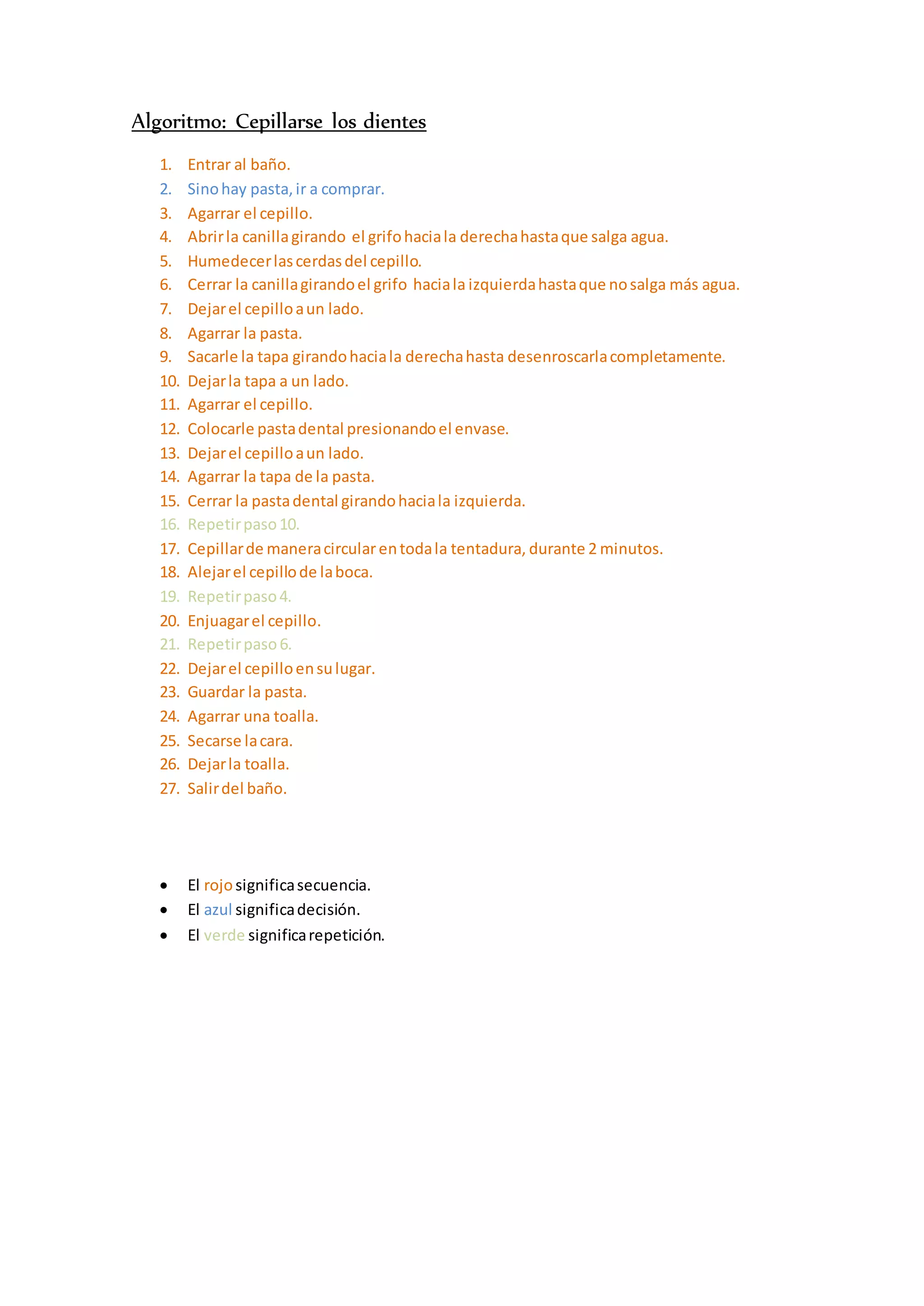 El documento proporciona un algoritmo de 27 pasos para cepillarse los dientes adecuadamente, incluyendo preparar el cepillo y la pasta dental, cepillarse los dientes durante 2 minutos, enjuagar el cepillo y guardar los materiales. El proceso involucra abrir la canilla, humedecer el cepillo, aplicar la pasta dental, cepillarse en movimientos circulares, enjuagar el cepillo y secarse la cara.