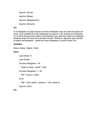 El documento presenta tres algoritmos. El primero recibe como entrada la cédula, nombre, apellido y profesión de una persona e imprime esta información. El segundo lee dos números e imprime la suma, resta, multiplicación y división. El tercero calcula el salario de un trabajador en base a su tarifa horaria y horas trabajadas, aplicando un recargo del 50% a las horas extras.