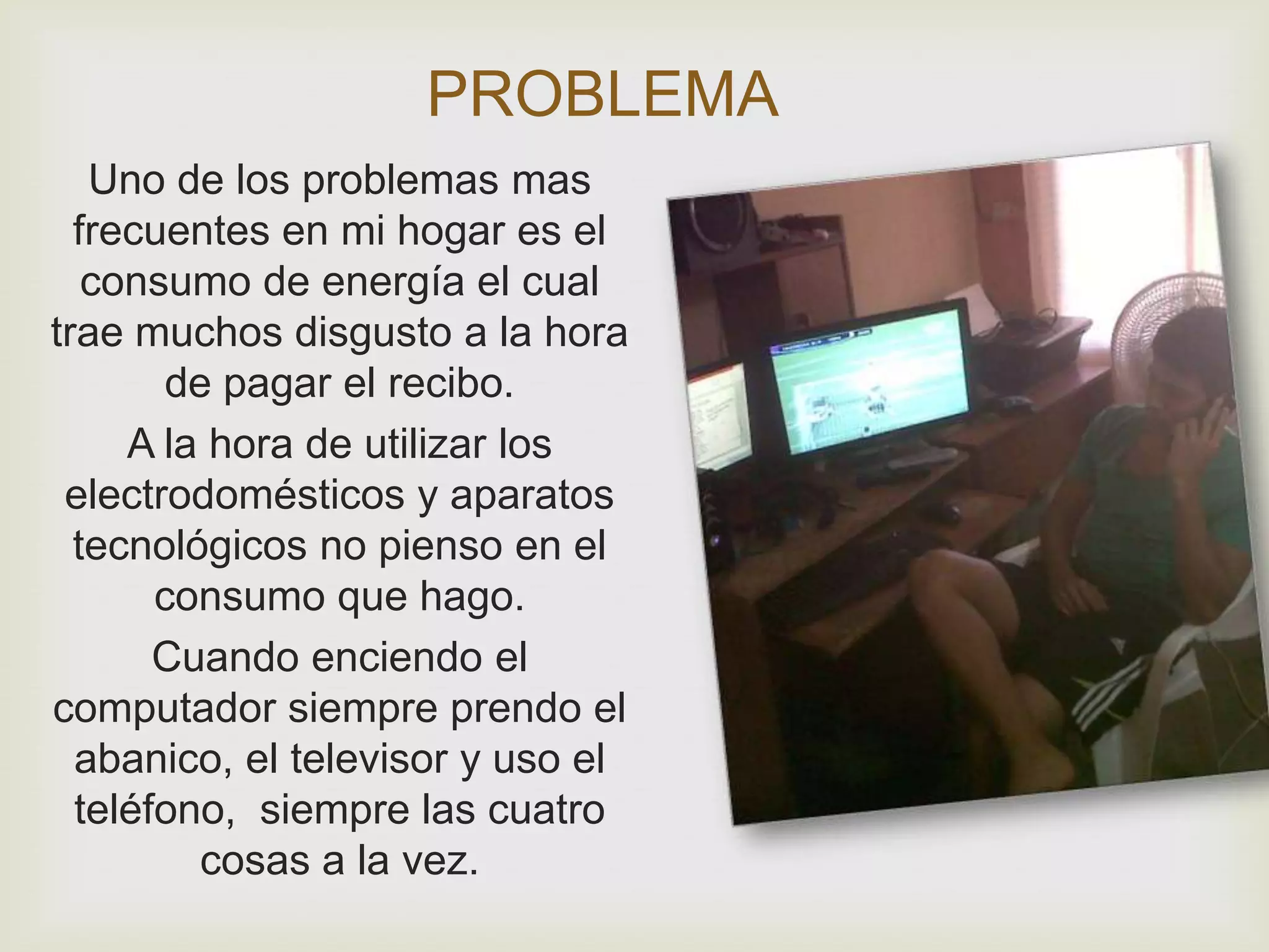 Este documento describe cómo el consumo excesivo de energía en el hogar causa problemas al pagar los recibos. Se enumeran los pasos para apagar correctamente los electrodomésticos como la televisión, el abanico, el teléfono y la computadora, así como desconectar los cables, para ahorrar energía y prevenir accidentes.