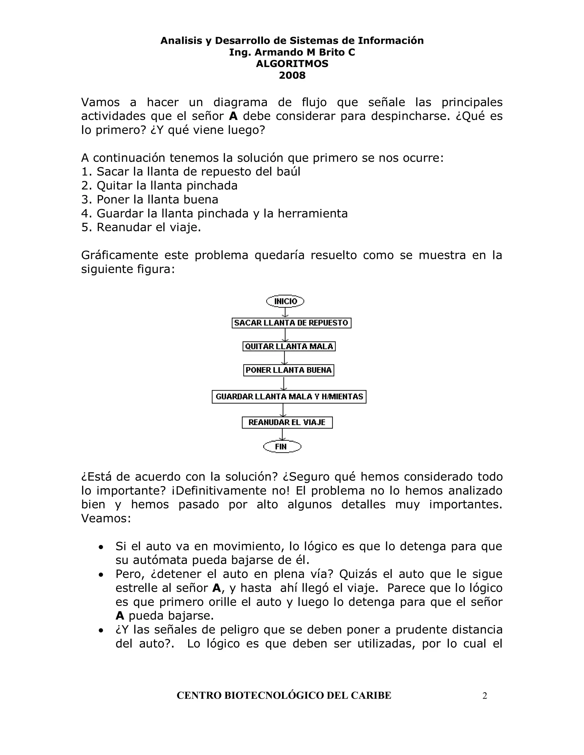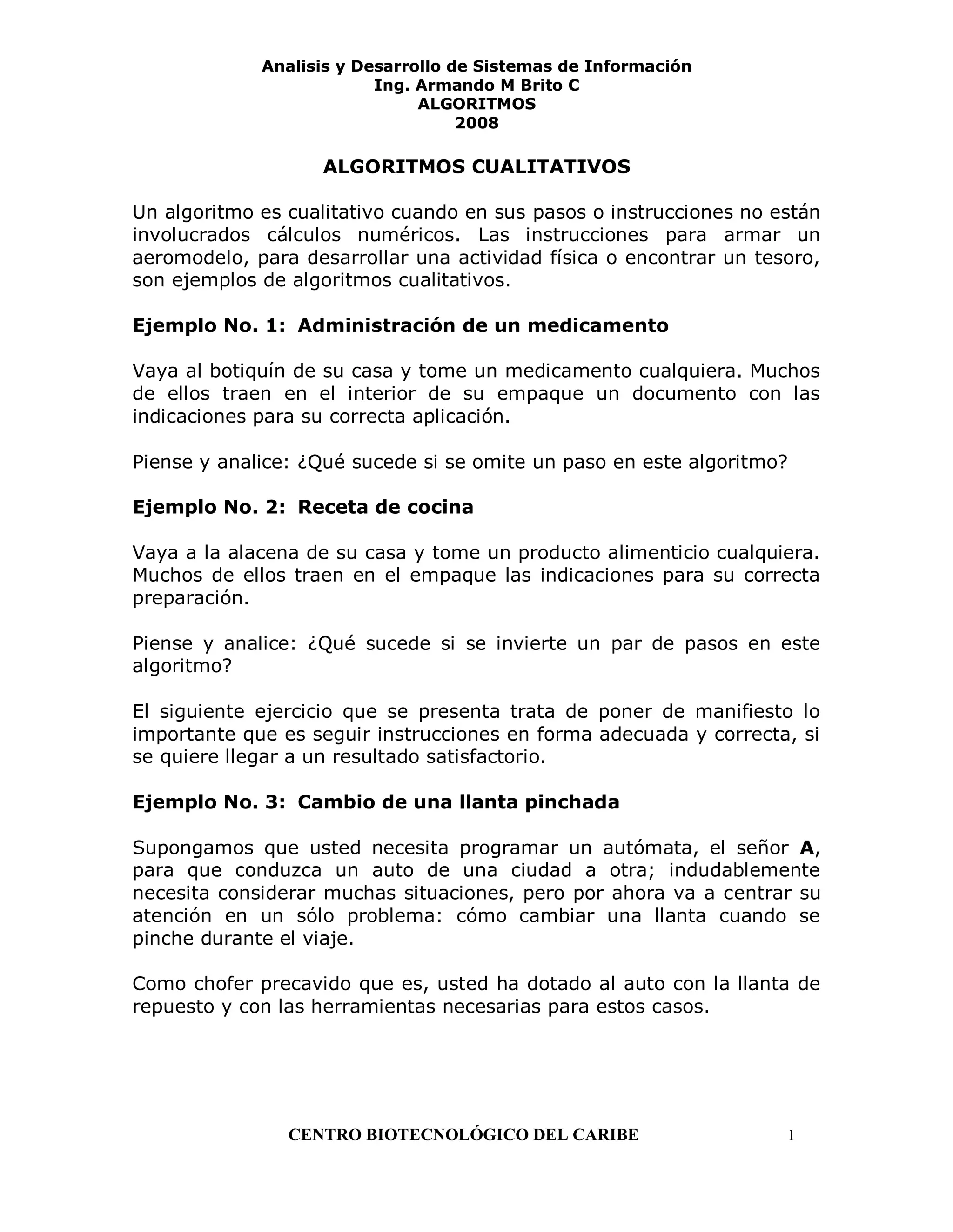 Este documento presenta varios ejemplos de algoritmos cualitativos, los cuales no involucran cálculos numéricos sino instrucciones para realizar actividades como administrar un medicamento, seguir una receta de cocina, cambiar una llanta pinchada, diagramar las actividades de un domingo y realizar una llamada telefónica. Explica la importancia de analizar cuidadosamente cada problema para identificar los pasos lógicos y el orden correcto en que deben realizarse, de modo que se obtenga el resultado esperado.