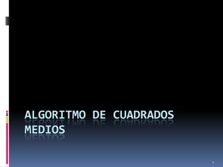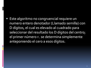 Este documento describe el algoritmo de cuadrados medios, un método no congruencial para generar números pseudoaleatorios. El algoritmo toma una semilla de D dígitos, la eleva al cuadrado, y toma los D dígitos centrales como el primer número aleatorio. Luego repite este proceso elevando al cuadrado el número anterior para generar el siguiente número, hasta obtener n números aleatorios. El documento también provee un ejemplo y señala las limitaciones del algoritmo.