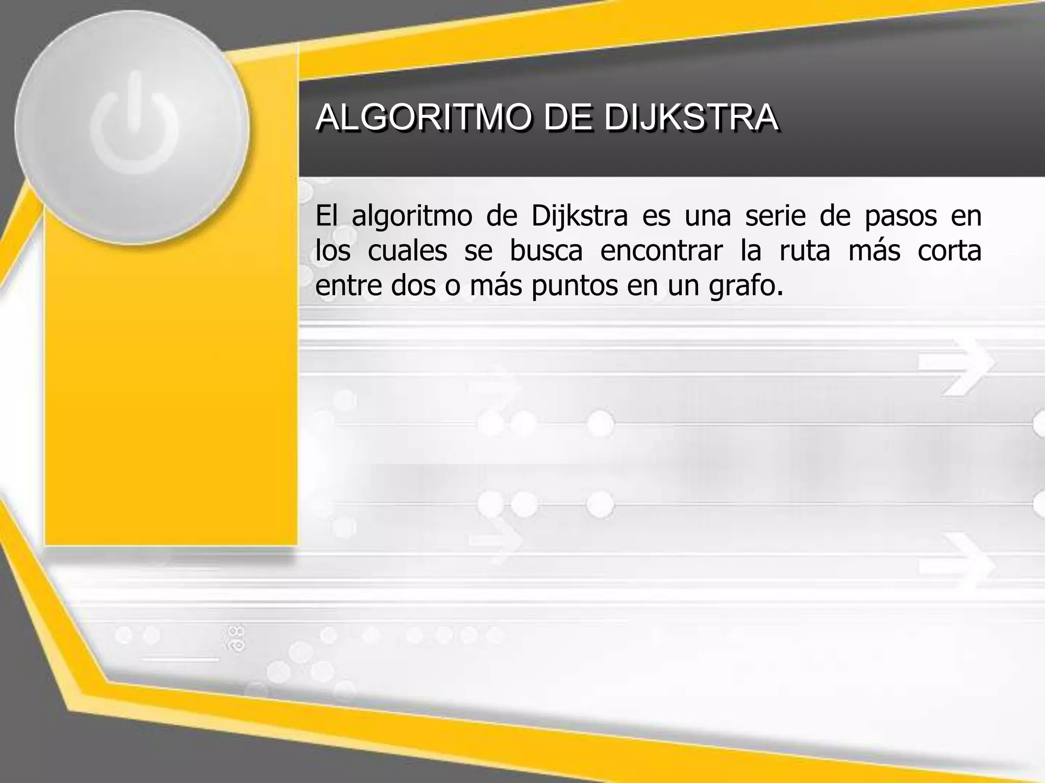 El documento describe el algoritmo de Dijkstra para encontrar la ruta más corta entre nodos en un grafo. Explica que se selecciona un nodo inicial y se calculan los pesos acumulados de los nodos adyacentes, repitiendo el proceso para los nodos restantes hasta completar el grafo con las distancias más cortas.