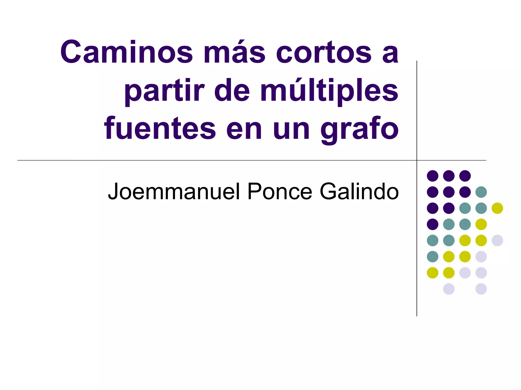 El documento explica los conceptos básicos de grafos y el problema de encontrar el camino más corto entre dos vértices en un grafo. Describe el algoritmo de Dijkstra para resolver este problema de manera eficiente en un grafo ponderado. También presenta variaciones como encontrar los caminos más cortos desde múltiples fuentes y su aplicación para problemas de logística como determinar el centro de distribución óptimo.