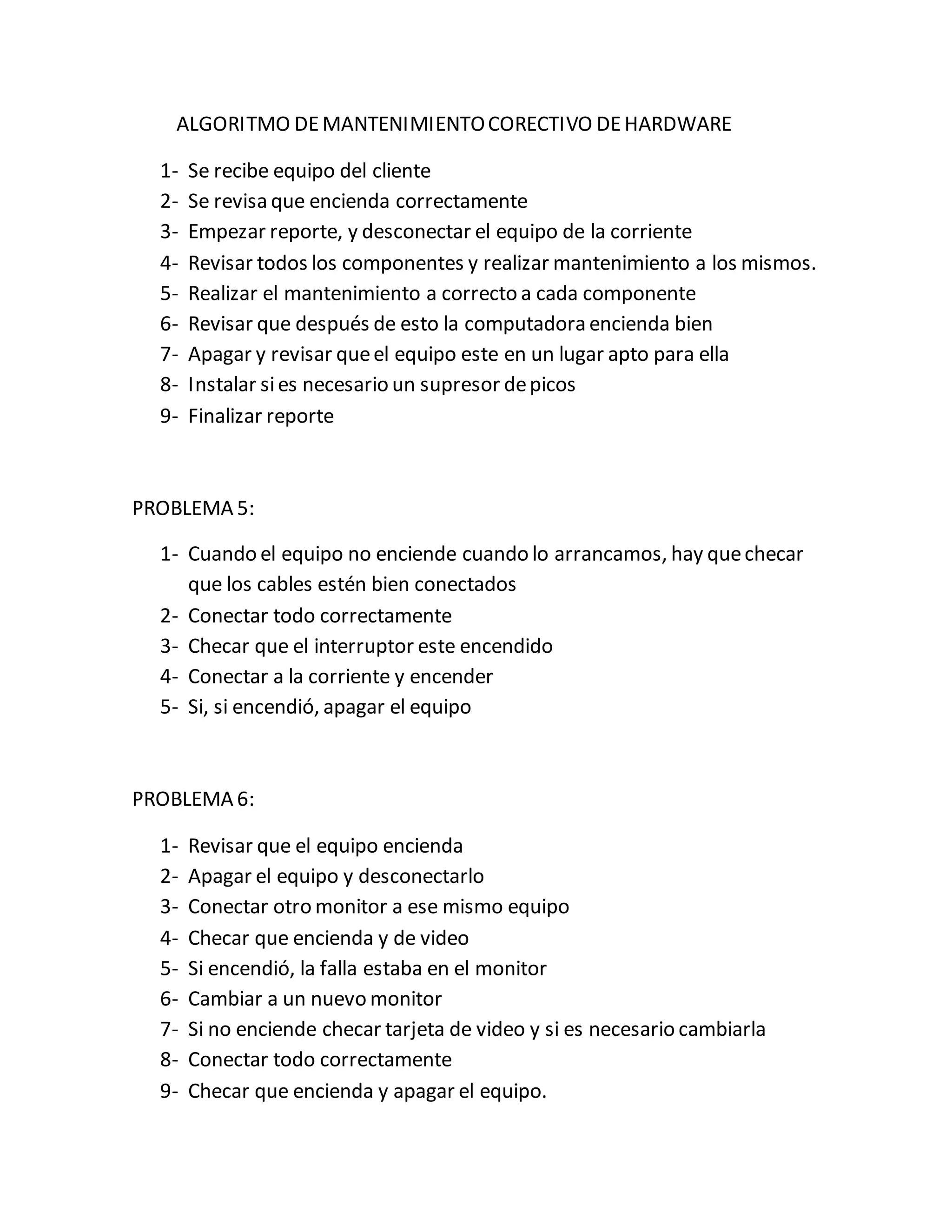 El documento describe un procedimiento de mantenimiento correctivo de hardware que incluye recibir el equipo del cliente, revisar que encienda correctamente, realizar mantenimiento a todos los componentes, revisar que el equipo encienda después del mantenimiento, y finalizar un reporte. También describe cómo diagnosticar y resolver problemas comunes como que el equipo no encienda al arrancar o que no de video, revisando cables, interruptores, probando con otro monitor o tarjeta de video.