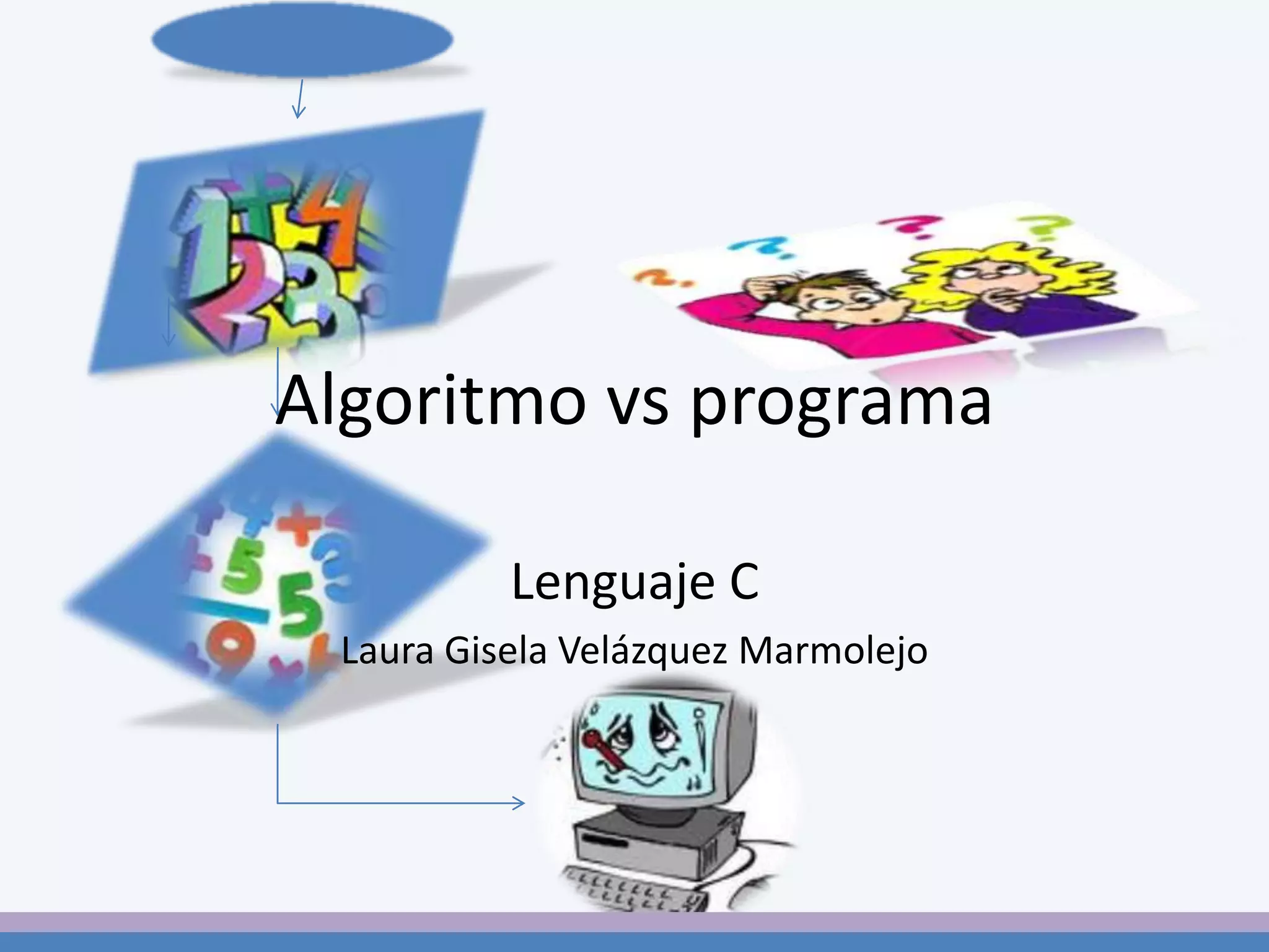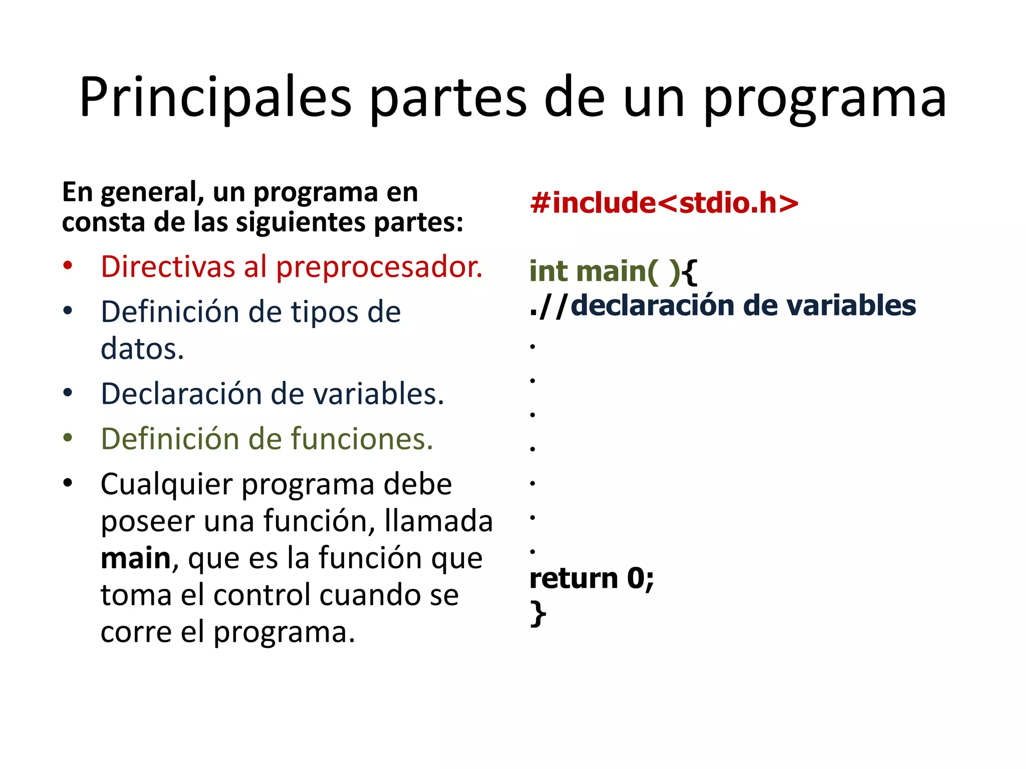 El documento describe los conceptos básicos del lenguaje de programación C, incluyendo las partes principales de un programa en C (directivas de preprocesador, definición de tipos de datos, declaración de variables, definición de funciones), los tipos de datos básicos en C (enteros, reales, caracteres), cómo declarar variables, y cómo traducir algoritmos a programas en C utilizando especificadores de formato en la función printf. Se proveen dos ejemplos de cómo traducir algoritmos que involucran operaciones matemáticas sobre variables a programas en C.