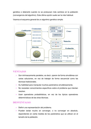 Los algoritmos genéticos son métodos de optimización inspirados en la evolución biológica que pueden usarse para resolver problemas complejos. Siguen pasos como evaluar la aptitud de soluciones codificadas, seleccionar las más aptas para reproducirse con mutaciones ocasionales, y repetir el proceso hasta converger. Se han aplicado con éxito en problemas de diseño, redes, almacenamiento y robótica.