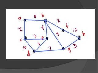 El algoritmo de Prim es un algoritmo para encontrar un árbol recubridor mínimo en un grafo conexo y no dirigido. Funciona marcando un nodo inicial y seleccionando la arista de menor valor entre nodos marcados y no marcados, repitiendo el proceso hasta marcar todos los nodos. Se usa comúnmente para implementar redes de cables y postes con el menor costo de recursos posible.