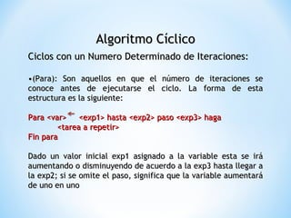 Este documento describe diferentes tipos de algoritmos cíclicos, incluyendo ciclos con un número determinado de iteraciones (como el ciclo para) y ciclos con un número indeterminado de iteraciones (como el ciclo mientras que y el ciclo repita-hasta). Proporciona ejemplos de cada tipo de ciclo para ilustrar su uso.