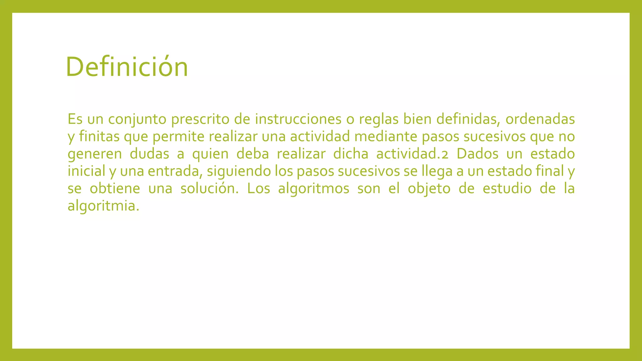 El documento define algoritmo y programación. Un algoritmo es un conjunto de instrucciones bien definidas y ordenadas para realizar una tarea y llegar a un resultado final. Las características de un algoritmo incluyen ser preciso, bien definido y finito. La programación adapta el algoritmo a la computadora. Un algoritmo debe tener pasos claros y un inicio y fin definidos. Las fases de desarrollo de algoritmos son analizar el problema, planificar la solución, codificar, compilar, corregir errores y documentar.