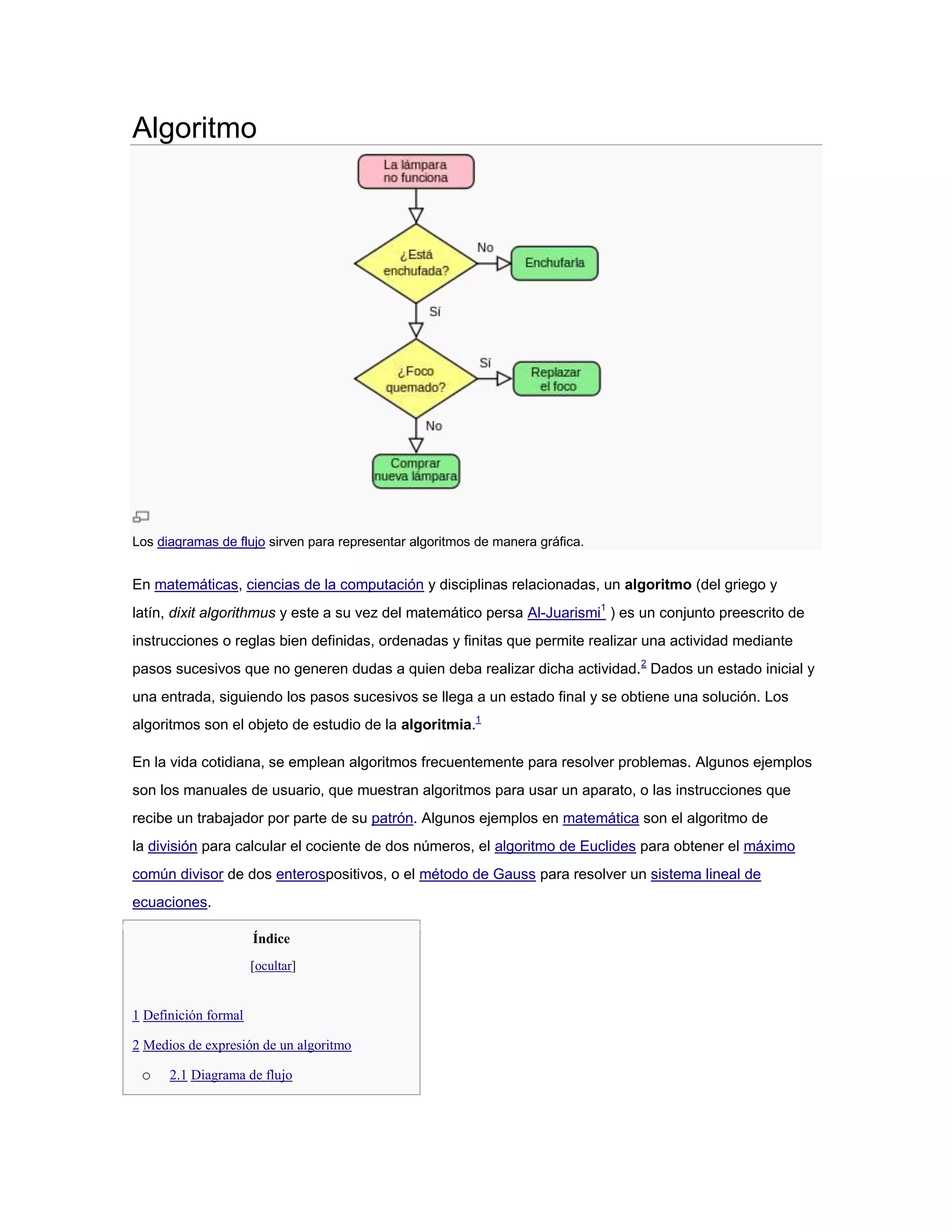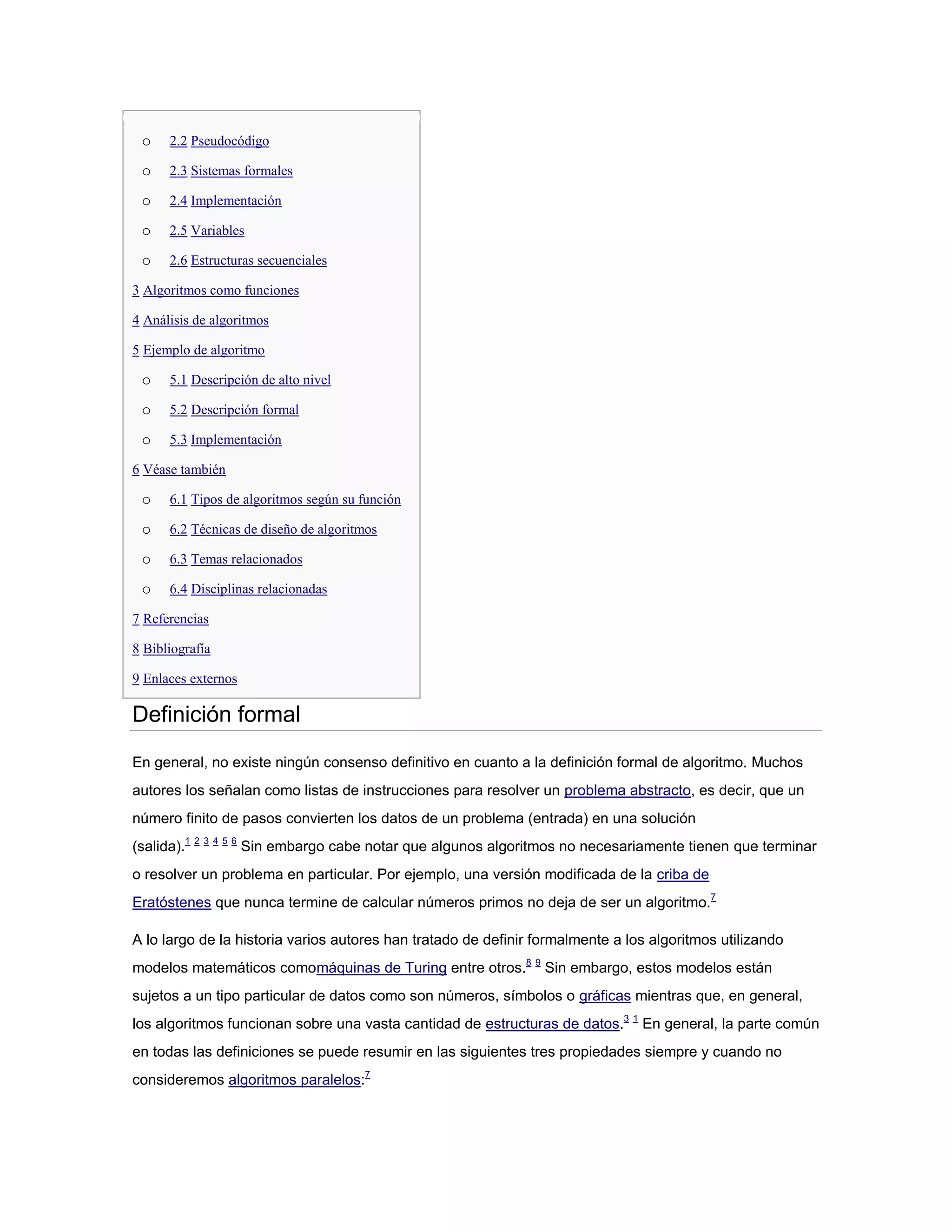 El documento describe los algoritmos y su representación. Los algoritmos son conjuntos de instrucciones para resolver problemas de forma secuencial. Pueden expresarse como diagramas de flujo, pseudocódigo o lenguajes de programación. El análisis de algoritmos evalúa su eficiencia en términos de tiempo y memoria.