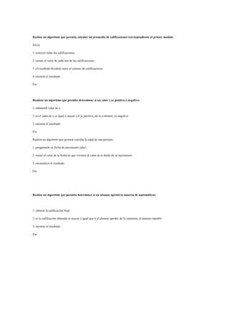 Un algoritmo es una serie de pasos ordenados y lógicos para resolver un problema. Los algoritmos tienen características como orden, determinación, finitud y precisión para lograr soluciones de manera eficiente. Algunos ejemplos de algoritmos presentados resuelven problemas como preparar agua de limón, calcular áreas de figuras geométricas, promedios y determinar valores positivos/negativos. También se incluyen algoritmos para enviar correos electrónicos.