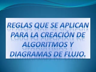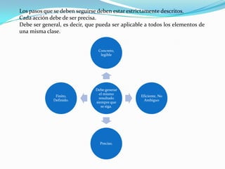 El documento describe los pasos para definir un algoritmo. Un algoritmo debe ser preciso, generalizable, generar el mismo resultado siempre y estar libre de ambigüedades. Contiene datos de entrada y salida, un proceso de instrucciones ordenadas y la información necesaria. Los algoritmos se representan gráficamente a través de diagramas de flujo que utilizan símbolos específicos.