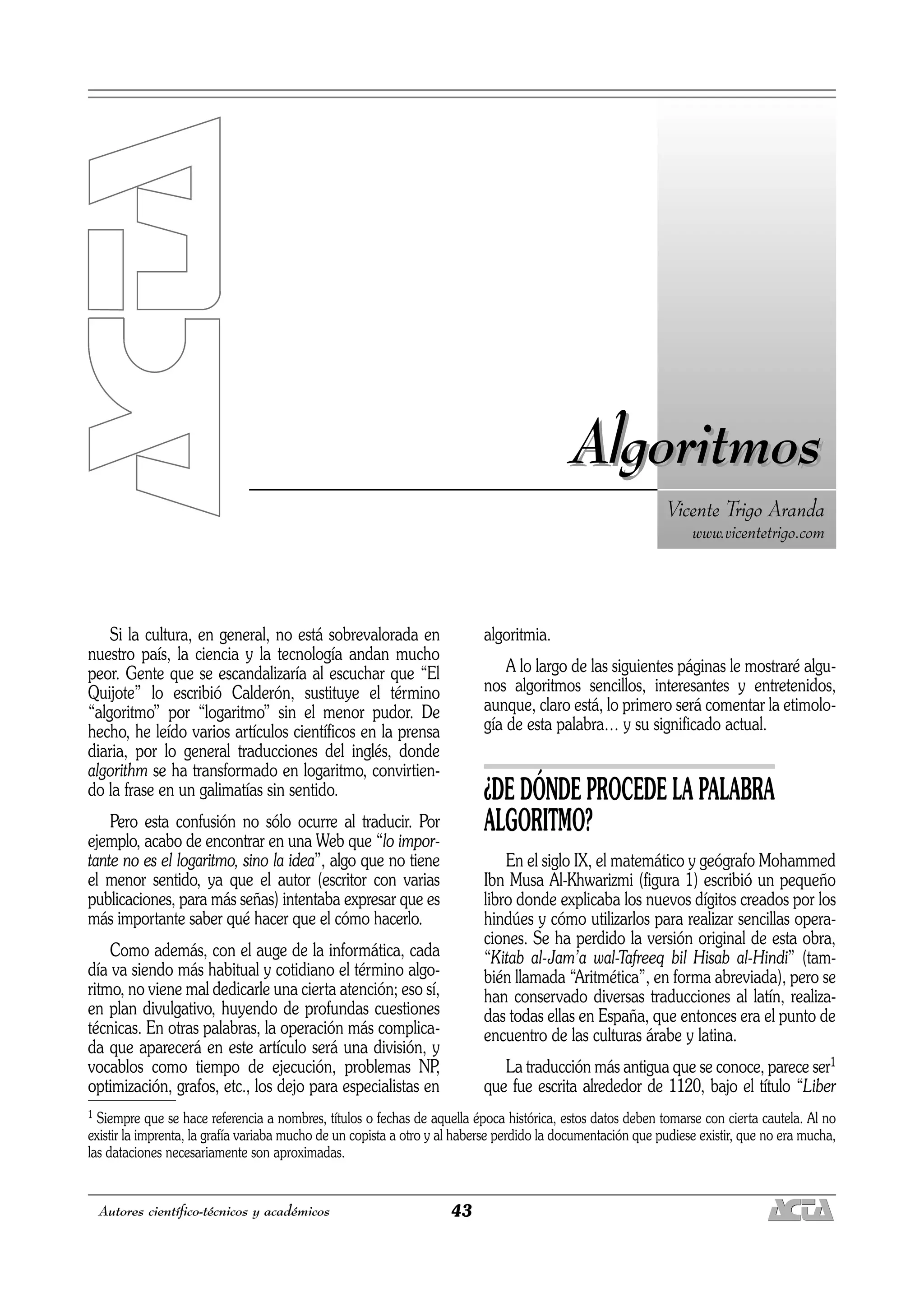El documento discute el origen de la palabra "algoritmo" y su significado actual. Explica que el término proviene del matemático árabe Al-Khwarizmi del siglo IX, aunque la RAE sostiene que procede del árabe "Hisab al-jabr", cálculo mediante cifras arábigas. Define un algoritmo como un conjunto ordenado y finito de operaciones para resolver un problema de forma precisa y definible. Presenta como ejemplo el algoritmo de Euclides para calcular el máximo común divisor de dos números.