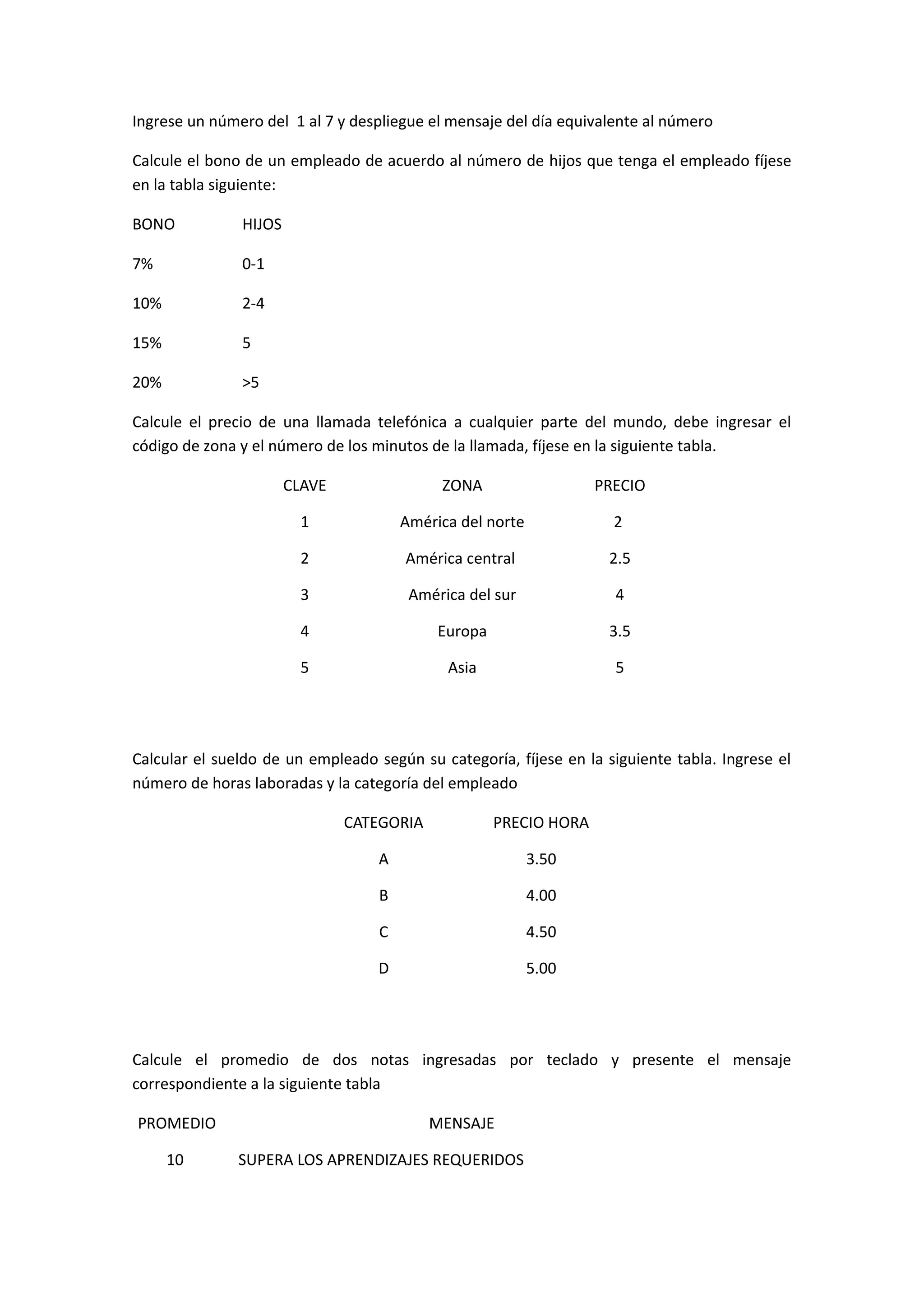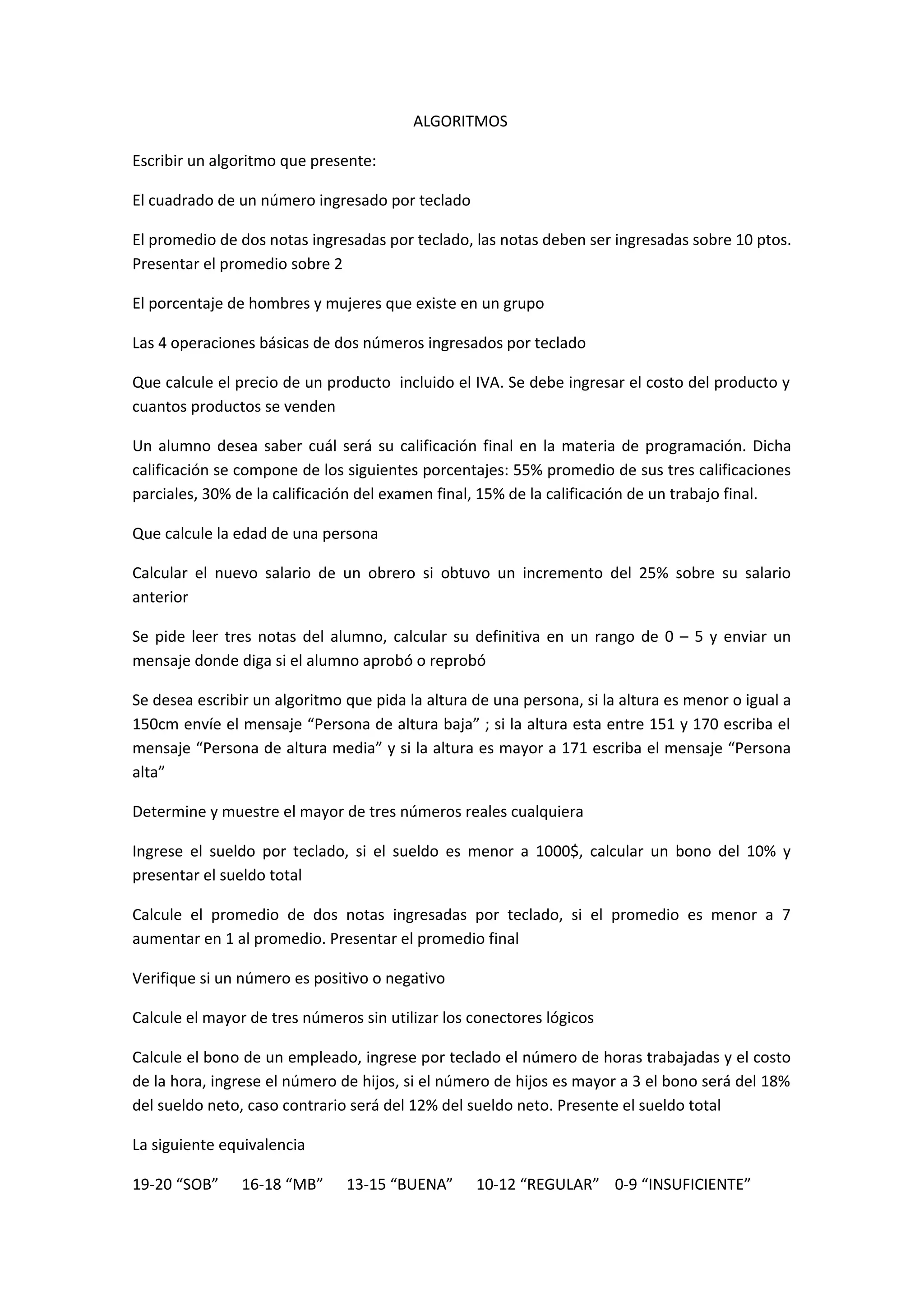 El documento presenta una serie de algoritmos que resuelven diferentes problemas matemáticos y lógicos, incluyendo el cálculo de cuadrados, promedios, porcentajes, operaciones básicas, IVA, calificaciones finales, edades, salarios, alturas, números mayores, bonos, llamadas telefónicas, sueldos, notas, números ordenados, divisibilidad, suma, triángulos, series, factoriales, primos, Fibonacci, promedios y arreglos. Los algoritmos utilizan estructuras secuenciales, condic