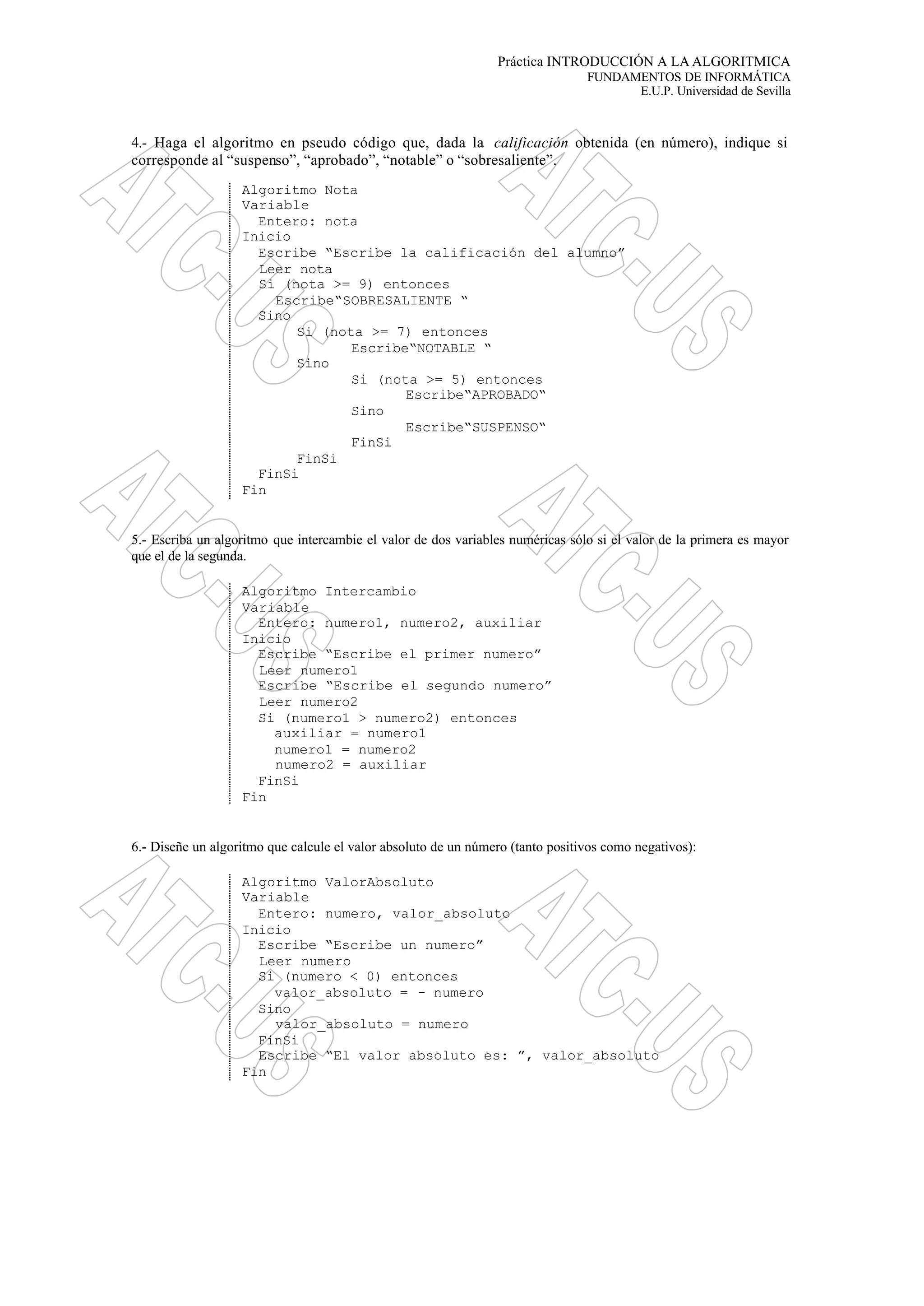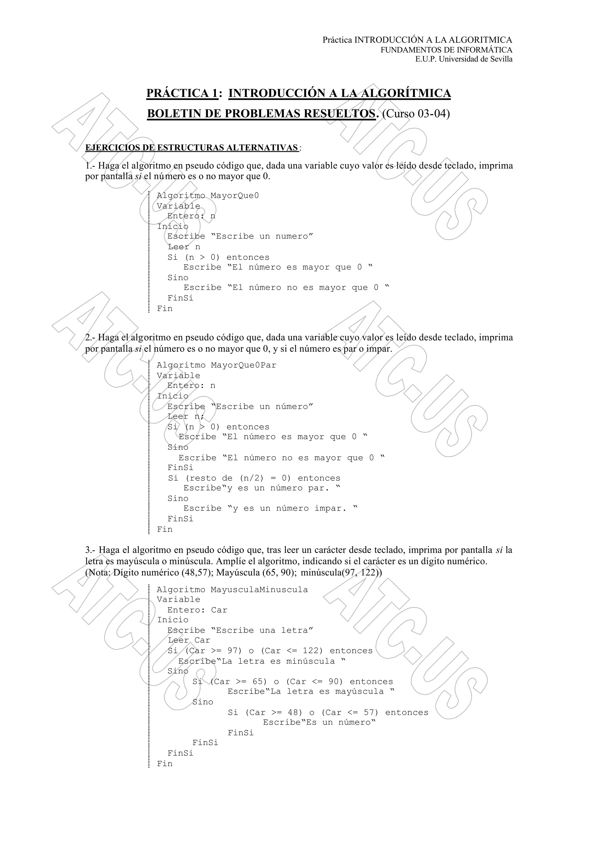 Este documento contiene 10 ejercicios de algoritmos en pseudocódigo sobre diferentes estructuras de control como condicionales, iterativas y vectores. Los ejercicios van desde comprobar si un número es mayor que cero hasta calcular la suma de los divisores de números introducidos por teclado.