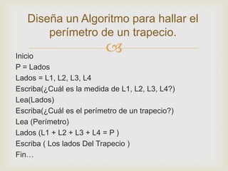 El algoritmo primero pide los lados del trapecio L1, L2, L3, L4 y define el perímetro P como la suma de los lados. Luego pregunta cuál es el perímetro de un trapecio y define la fórmula perímetro = L1 + L2 + L3 + L4.