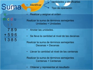 El documento describe los pasos para realizar las operaciones básicas de suma, resta, multiplicación y división con números decimales. Para cada operación, los pasos incluyen identificar y clasificar las cantidades, determinar el tipo de operación, realizar la operación con términos semejantes de unidades, decenas y centenas, y obtener y representar el resultado.