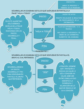 Este documento presenta 13 problemas resueltos mediante diagramas de flujo. Cada problema describe una operación matemática o lógica diferente y proporciona el diagrama de flujo correspondiente para resolverlo. Adicionalmente, cada diagrama incluye una tabla de prueba de escritorio para validar la solución propuesta. El documento provee ejemplos completos de cómo desarrollar diagramas de flujo para diferentes tipos de problemas.