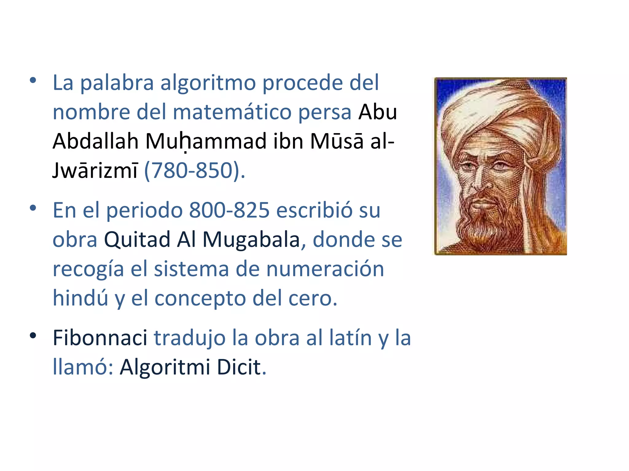 El documento describe los orígenes del término algoritmo y sus definiciones. Explica que un algoritmo es una secuencia ordenada de pasos para resolver un problema de manera precisa. Describe las secciones principales de un algoritmo y características deseables. Finalmente, presenta algunos ejemplos de algoritmos para calcular áreas y perímetros.