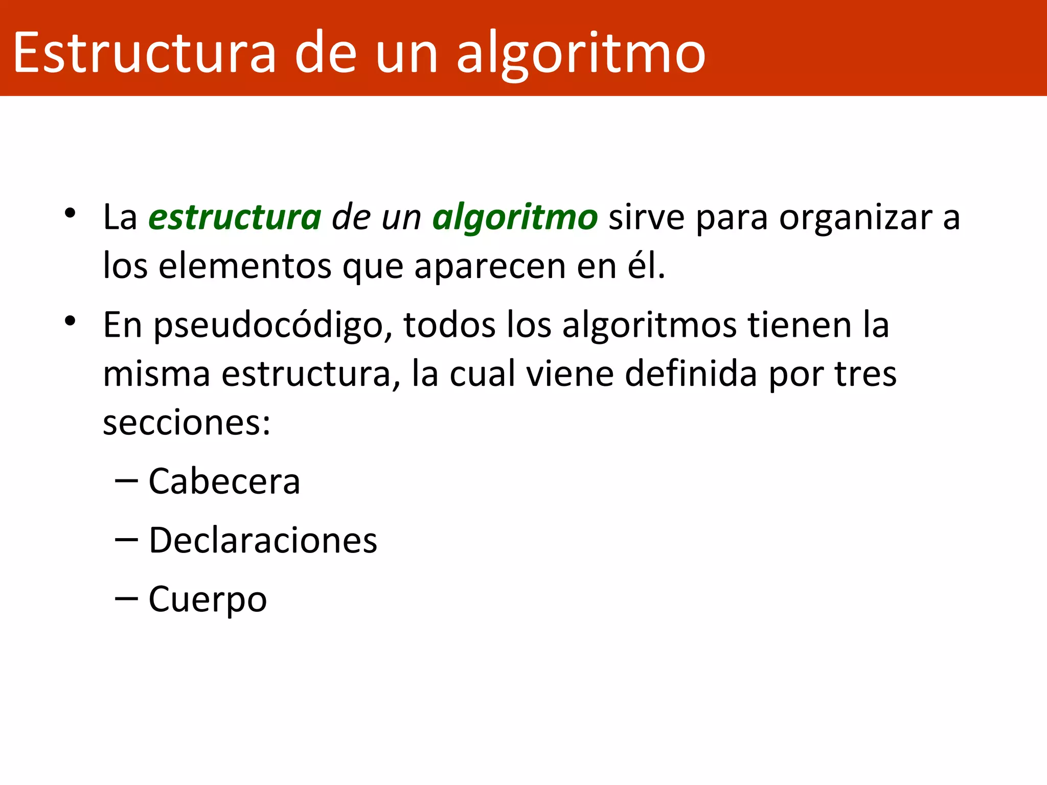 El documento describe la estructura y componentes básicos de los algoritmos. Explica que un algoritmo consta de una cabecera, declaraciones y cuerpo. Detalla las sentencias básicas como escritura, lectura y asignación, así como las estructuras secuenciales, selectivas y repetitivas que componen los algoritmos. Finalmente, presenta ejemplos de algoritmos en pseudocódigo.