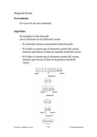 El documento describe diferentes algoritmos de búsqueda en vectores. La búsqueda lineal recorre el vector elemento a elemento hasta encontrar una coincidencia con el valor buscado. La búsqueda binaria requiere que el vector esté ordenado y compara el valor buscado con el elemento central, descartando la mitad del vector y repitiendo sobre la mitad restante de forma recursiva hasta encontrar una coincidencia. Se implementan versiones recursiva e iterativa de la búsqueda binaria.