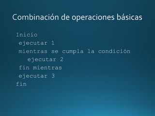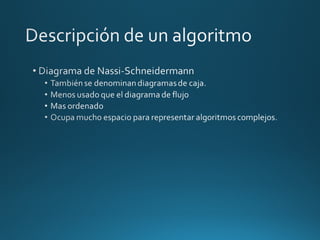 Este documento presenta varios algoritmos y diagramas de flujo para resolver diferentes problemas. En menos de 3 oraciones: El documento incluye algoritmos para calcular el peso en gramos de una manzana basado en su peso en kilos, sumar valores iterativamente usando un bucle, y validar valores de entrada usando condicionales. También presenta diferentes representaciones gráficas como diagramas de flujo y de Nassi-Schneidermann para modelar el flujo lógico de los algoritmos.