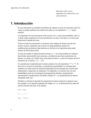 El documento describe varios algoritmos de ordenación, incluyendo ordenación por selección, ordenación por inserción y ordenación de Shell. Explica las características de cada algoritmo y analiza su complejidad temporal, generalmente en notación O grande. También discute conceptos como inversión y k-ordenación que son importantes para el análisis de los algoritmos. El código de los algoritmos se comparte bajo licencia GPL.