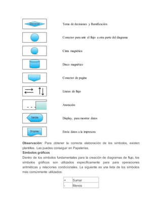 El documento describe los diagramas de flujo y sus componentes. Explica que los diagramas de flujo representan visualmente el flujo de datos a través de sistemas de información y describen las operaciones y secuencia requeridas para resolver un problema. Luego detalla los símbolos comúnmente usados en los diagramas de flujo como inicio, procesos, decisiones, conectores y líneas de flujo. Finalmente, provee un ejemplo de diagrama de flujo para calcular la suma de los primeros 50 números naturales.