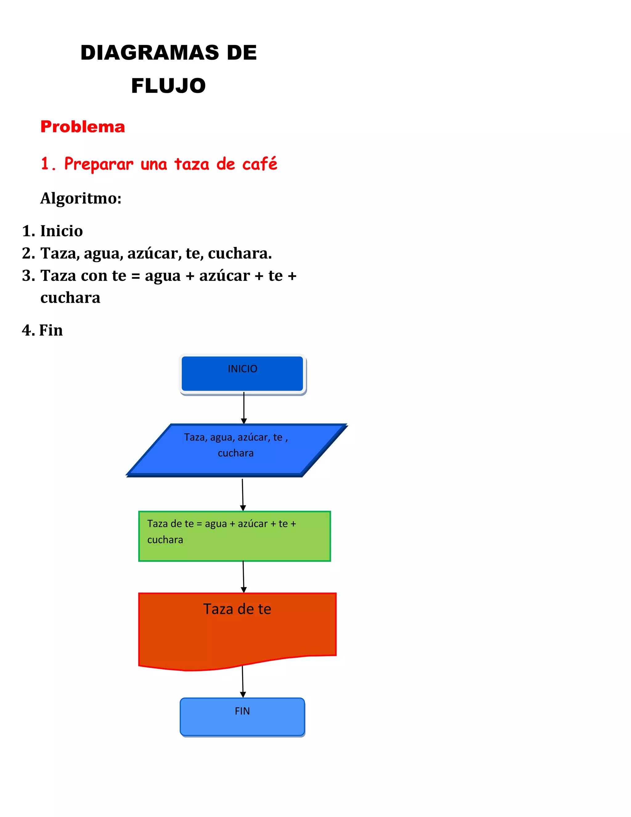 Este documento presenta 10 problemas y sus respectivos algoritmos para resolverlos de manera secuencial mediante diagramas de flujo. Los problemas incluyen preparar café, multiplicar números, calcular edad, sacar promedio de notas, calcular áreas de figuras geométricas como círculo y rectángulo, calcular IVA, elaborar sándwiches y pasteles, y calcular área de triángulo.