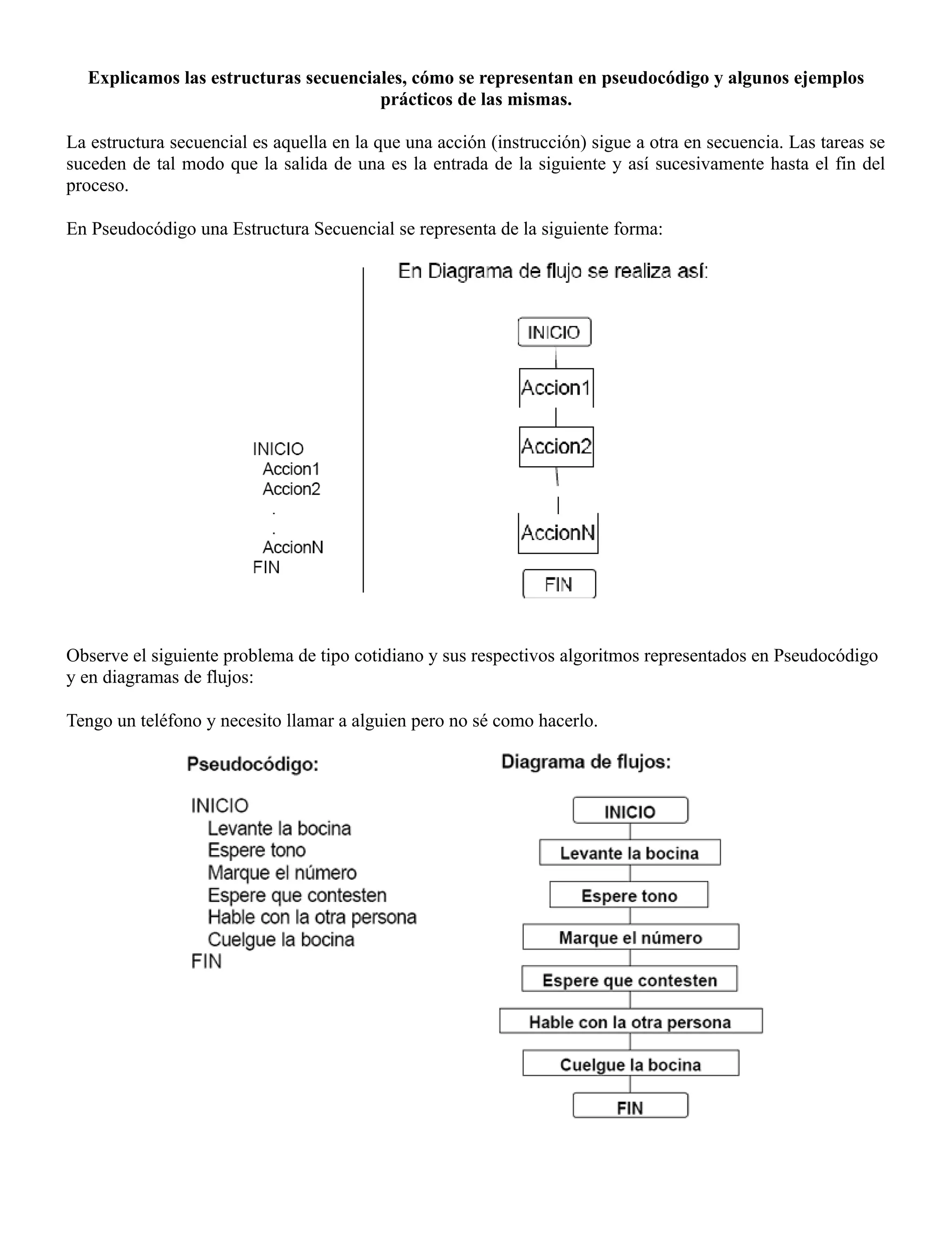 Este documento explica las estructuras secuenciales en algoritmos, cómo se representan en pseudocódigo y incluye ejemplos. Describe los componentes básicos de una estructura secuencial como la asignación, entrada/salida de datos, y declaración de variables. Finalmente, presenta dos ejemplos de algoritmos sencillos expresados en pseudocódigo y diagramas de flujo.