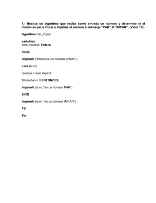 El documento describe dos algoritmos: uno para determinar si un número es par o impar y otro para calcular el aumento salarial de los trabajadores universitarios basado en su tiempo de servicio. El primer algoritmo utiliza operaciones básicas para verificar la paridad de un número, mientras que el segundo algoritmo aplica porcentajes de aumento según rangos de años laborados. Ambos algoritmos son parte de un ejercicio académico relacionado con la computación.