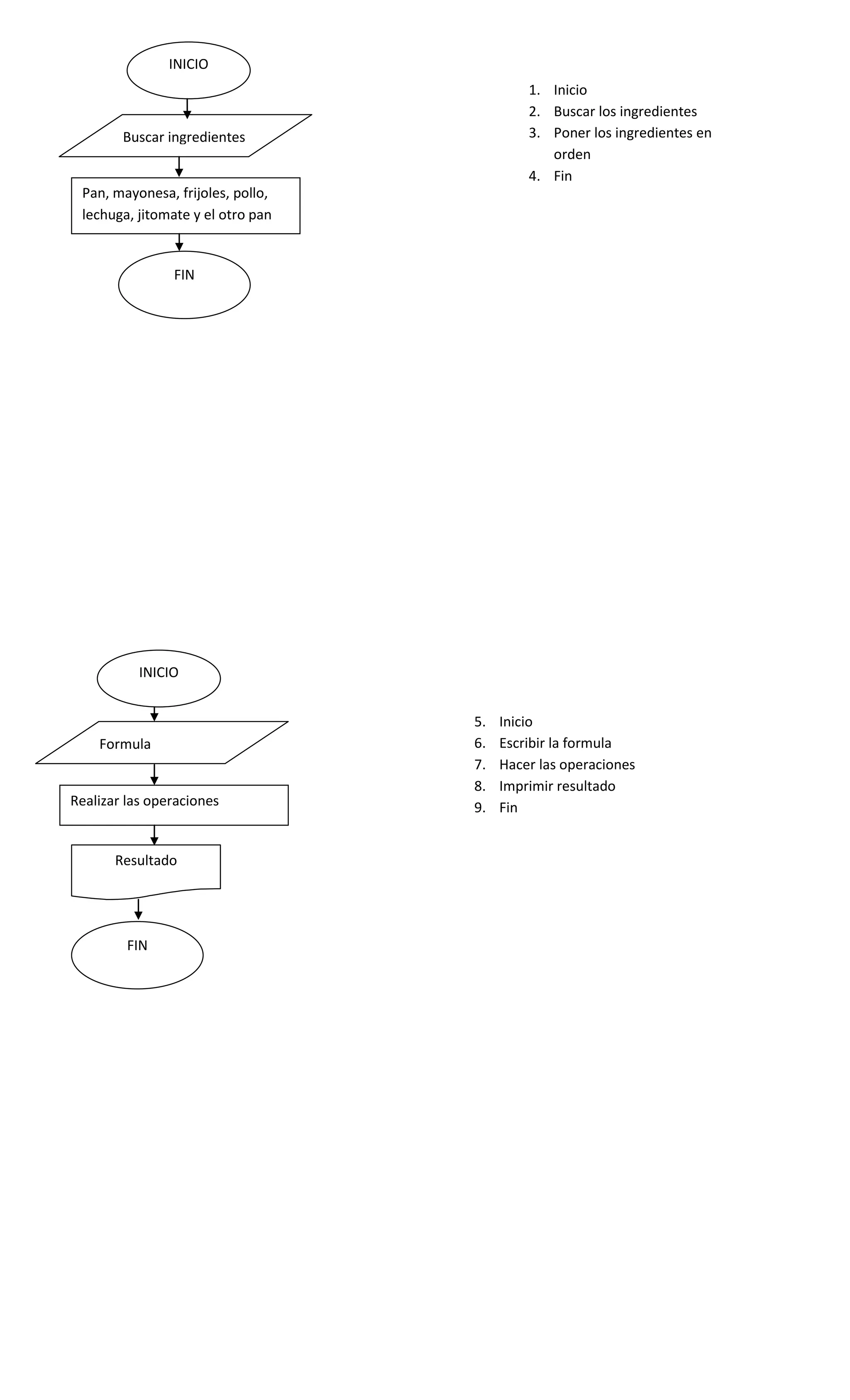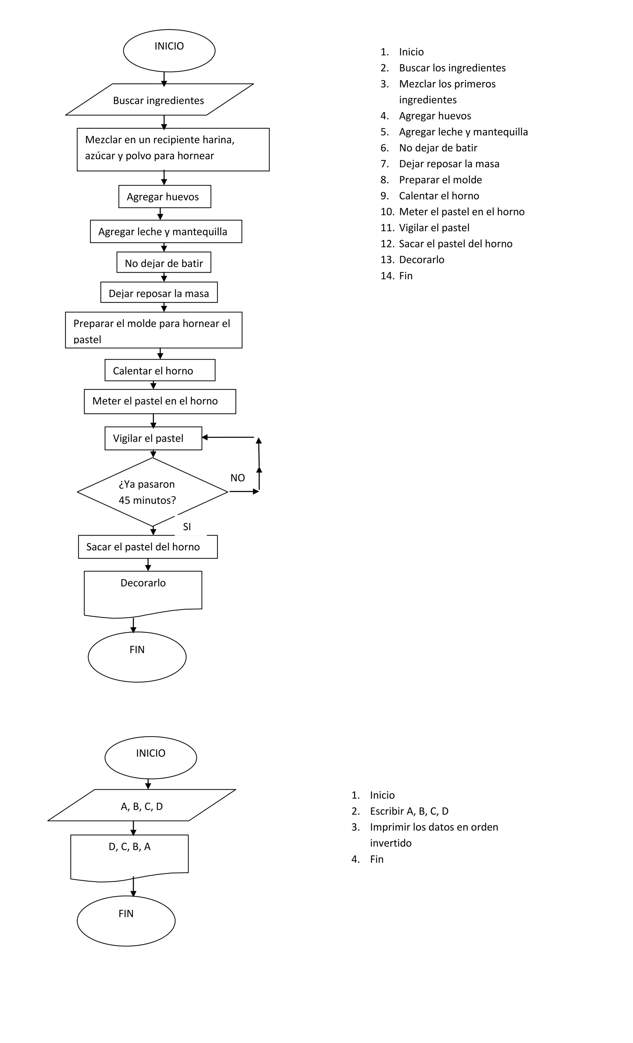 1. Los documentos presentan instrucciones para realizar diferentes tareas como hornear un pastel, calcular promedios y realizar operaciones matemáticas.