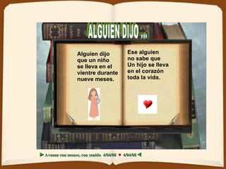El documento contiene una serie de frases dichas por "alguien" sobre la maternidad y crianza de hijos, seguidas de una refutación que comienza con "Ese alguien". La idea principal es que ser madre es mucho más complejo de lo que la gente suele pensar y que la experiencia real de criar hijos es diferente a las simplificaciones o suposiciones de los que no son padres.