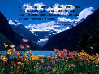 El documento describe cómo las personas y experiencias que encontramos en la vida, incluso las dolorosas, juegan un propósito y nos ayudan a crecer. Sin enfrentar retos y superar momentos difíciles, nunca alcanzaríamos nuestro potencial o fortaleza. Todas las experiencias, buenas o malas, ocurren por una razón y nos enseñan lecciones valiosas.