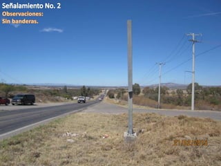 El documento describe 6 señalamientos en una carretera de Jalisco que dirigen a los vehículos hacia una autopista de cuota con rumbo a Aguascalientes, sin mencionar una ruta alternativa gratuita que pasa por la ciudad de Encarnación de Díaz. Esto perjudica la economía local al desviar el tráfico. Se concluye que los señalamientos fueron retirados a propósito para beneficiar a la autopista de cuota.