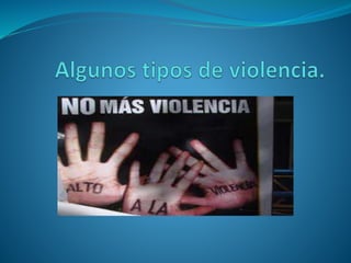 El documento trata sobre tres tipos de violencia: la violencia intrafamiliar, que es un fenómeno común causado por múltiples factores con consecuencias que afectan a numerosas personas; la violencia de género, que se refiere a la violencia ejercida por un hombre contra una mujer, normalmente en el contexto de una relación de pareja; y la violencia escolar, que se define como acciones u omisiones intencionalmente dañinas entre miembros de la comunidad educativa que ocurren dentro o cerca de las instalaciones escolares.